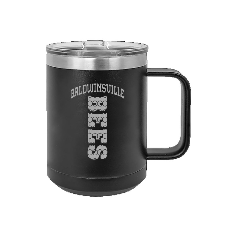 15oz Insulated Mug w/ Laser-Engraved B’ville logo in black and red.
