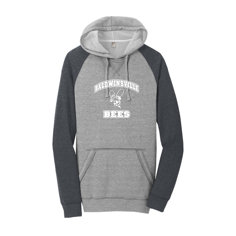 District Lightweight Fleece Raglan Hoodie with B’ville logo in Heathered Red/Charcoal and Heathered Gray/Charcoal.