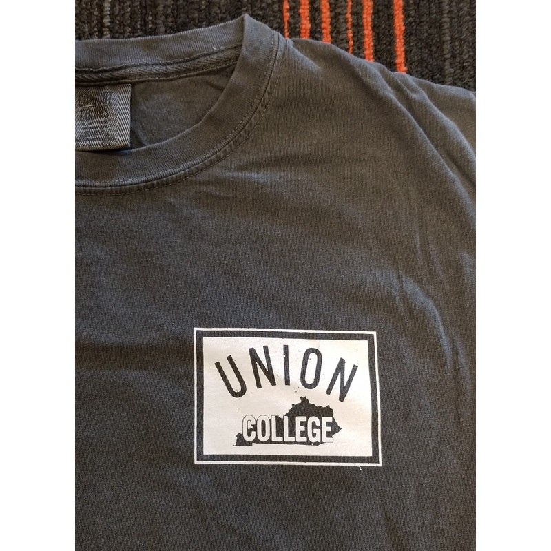 - Wording: Front, Union College in a white “stamp” look with the KY state shape behind the College word.