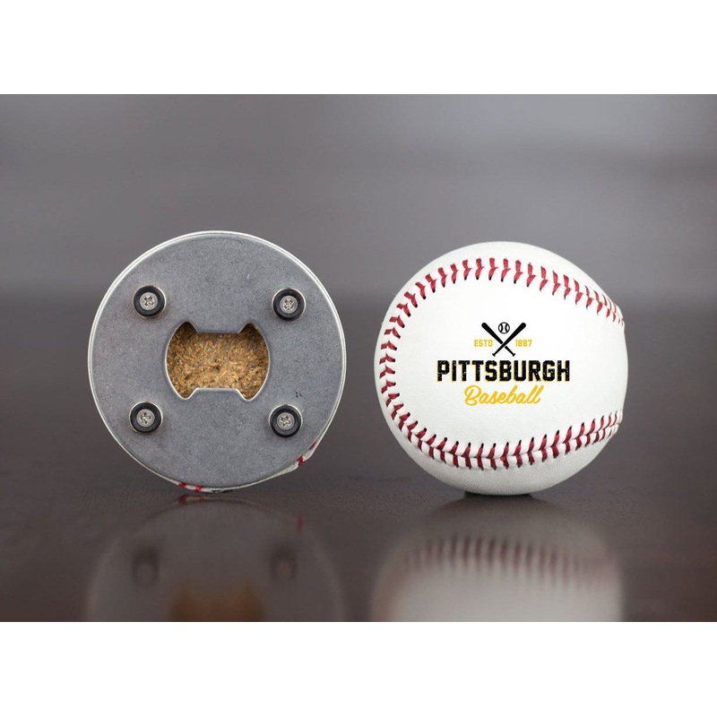 We combined baseball and drinking beer, two of American’s greatest traditions, to come up with the BaseballOpener, a bottle opener made from half of a REAL Leather Baseball. This particular listing features our Pittsburgh Baseball design printed onto the ball with a UV cured ink. If you’d like to see what other designs we have available click here, if you would like to customize your own BaseballOpenerthen click here.