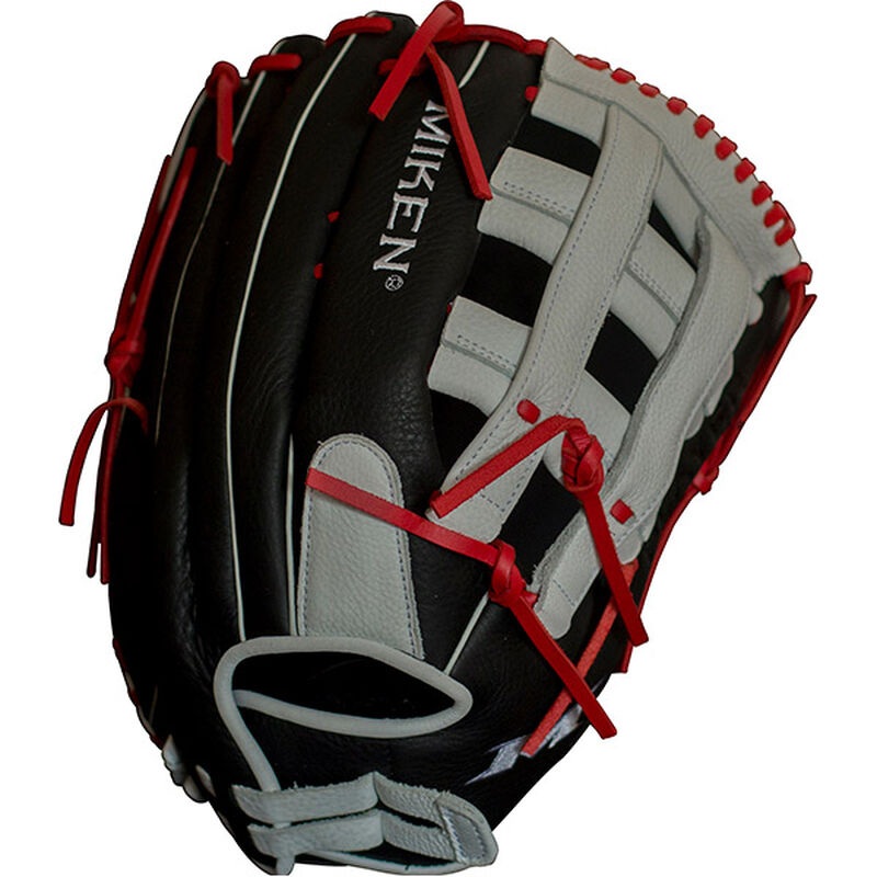 Miken Player Series 13″ slow pitch softball glove features a professional inspired slowpitch specific pattern, and game-ready, full-grain leather for enhanced durability. The PORON XRD palm pad reduces ball impact on your hand, and the adjustable pull-strap back allows for a custom fit around your wrist.