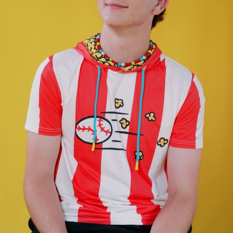 Bring the energy of the ballpark straight into your wardrobe with theStriped Shoodie from Plate Crates July 2025 Amusement Crate! With bold red and white stripes inspired by classic popcorn bags and a flying baseball design surrounded by buttery popcorn kernels, this short-sleeve hoodie is your ticket to ultimate summer baseball style.