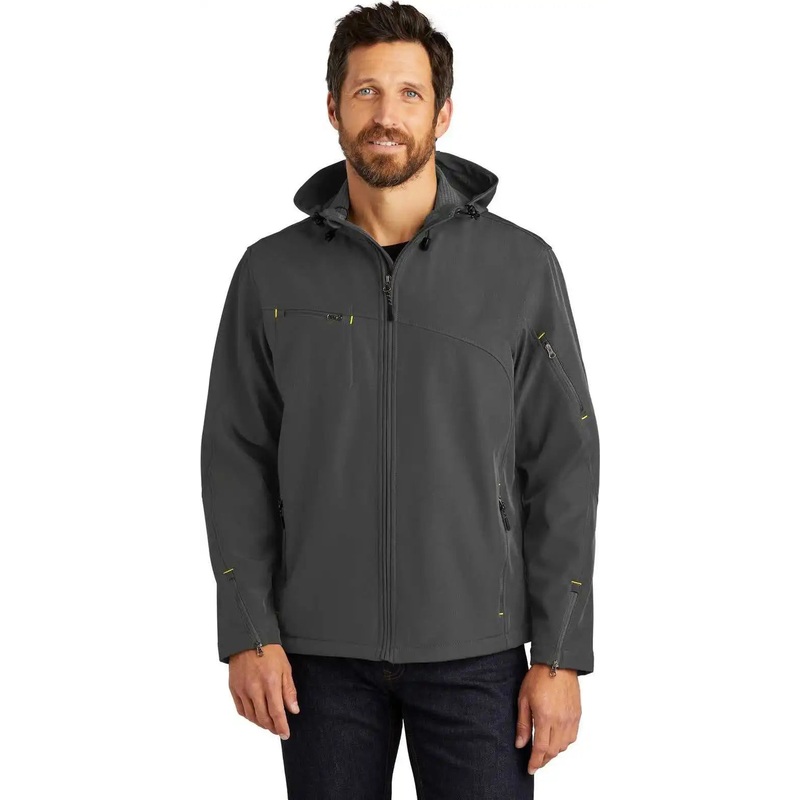 Our hooded soft shell stands up to the elements and stands out with texture and bar tack details. Highly breathable with stretch, this wind-resistant, water-repellent jacket is just right for the workday or the weekend. A hood and zippered sleeve vents add function and up-to-the-minute appeal.