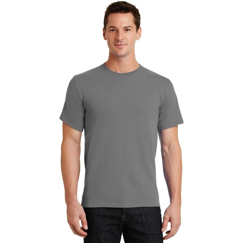 50/50 cotton/poly (Dark Heather Grey, S. Green, S. Orange)