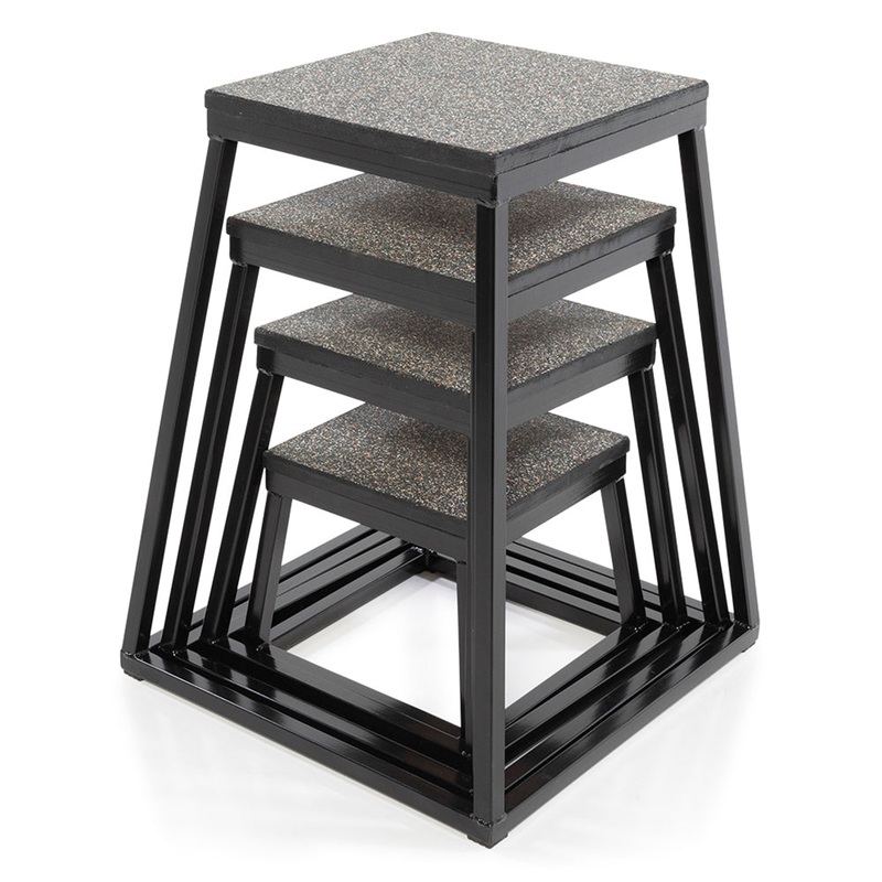 Fitness classic in a full range of sizes! Plyometric boxes from Power Systems are designed to provide maximum stability and durability during your workout. Our plyo boxes are constructed of fully welded steel frames, and the tops are made from reinforced plywood with a non-slip surface to maximize safety. Black/black. Specific dimensions below. Starter and Advanced kits available. Use indoor/outdoor.