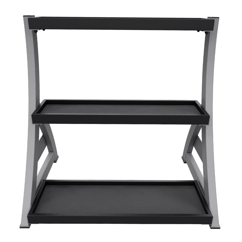 Perfect for personal training studios or small spaces. Keep up to twelve kettlebells organized and off the floor with this 3-tier rack. The rubber mats on the shelves reduce noise when putting the kettlebells away and protects them from additional wear and tear. The back lip on each shelf of the rack prevents your kettlebells from falling through. Power Systems kettlebells are sold separately. Some assembly required. 31″ L x 23″ deep x 33″ H.