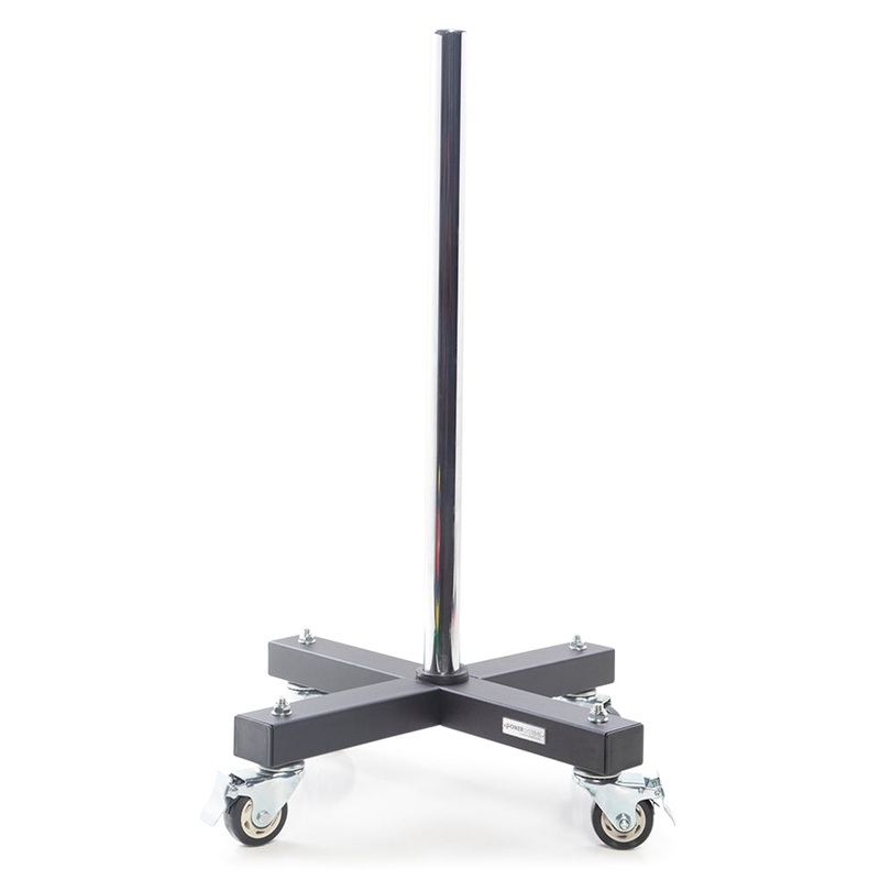 Portable, space-saving bumper plate storage. Keep bumper plates off the floor and organized. Black, X-shaped steel base with four locking casters is sturdy enough to support up to 800 lbs. Chrome center post is 32″ H and resists scratches and scuff marks. Easily roll this vertical plate stacker out of the way when not in use.