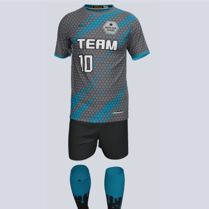 “Unleash the power of the pitch with our Custom ‘Hex’ soccer uniform set! This revolutionary ensemble is fully customizable, allowing you to create a design that hex-cites your team’s unique style. Elevate your team pride to a whole new level and dominate the field with confidence. With customizable jerseys and socks, you can showcase your team’s identity like never before. And with our advanced moisture-wicking technology, sweat won’t stand a chance against your performance. Trust that your decision to invest in this extraordinary soccer uniform will leave your opponents hex-asperated and your teammates hex-static. Get ready to unleash your soccer magic with the ‘Hex’ soccer uniform set!”