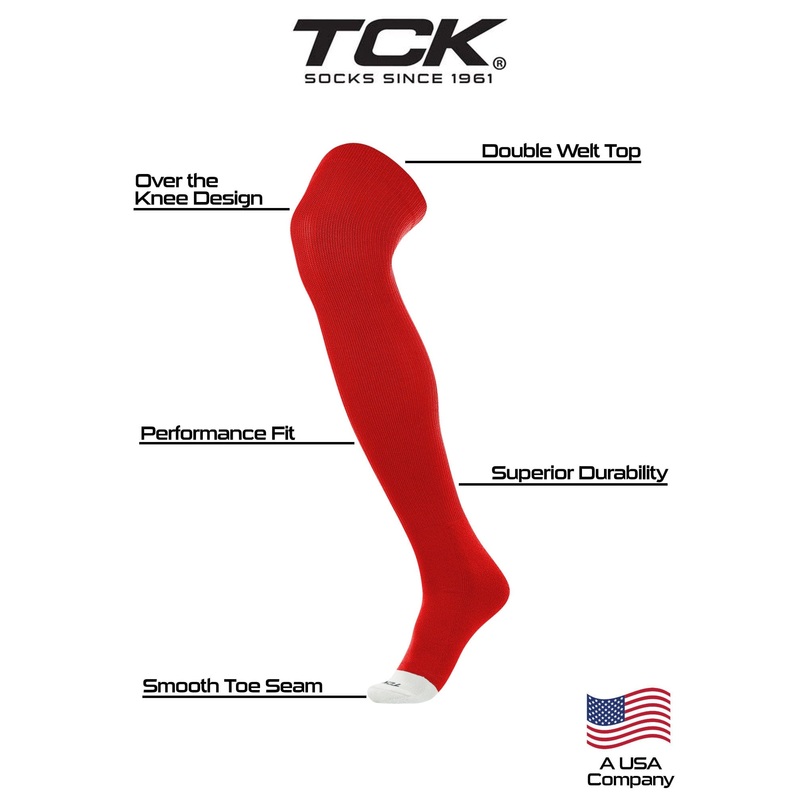 Our TCK Prosport Over the Knee Baseball/Football socks are a must have for your next game, outing, or practice. Designed by the leaders in team athletic socks, the Prosport is the ideal weight and length for athletes, while it also provides maximum performance and durability. TCK was founded in 1961 in North Carolina, where we still operate today. When purchasing TCK products, you can feel proud to support a USA based company that directly supports American employees.
