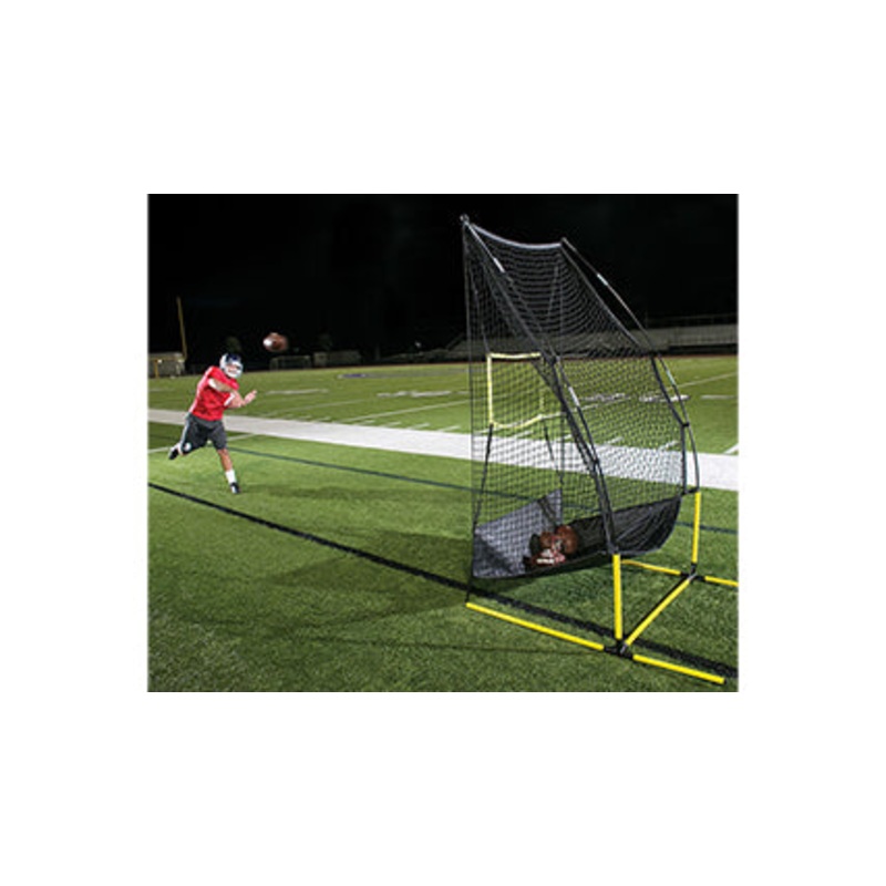 The SKLZ Quickster 4-in-1 is a football multi-skill training net that allows you to train for it all- punt, pass, kick or snap. Train like a pro with the hi-viz target and all-weather catch net that keeps balls clean throughout practice. High-strength steel corner joints mean the Quickster 4-in-1 will last season after season. Designed with pre-connected poles for easy assembly and take down. The lightweight, portable design and included carry bag makes it easy to transport from practice to the backyard. Stands 7 x 4 feet when fully assembled and includes ground stakes for securing the net during training.