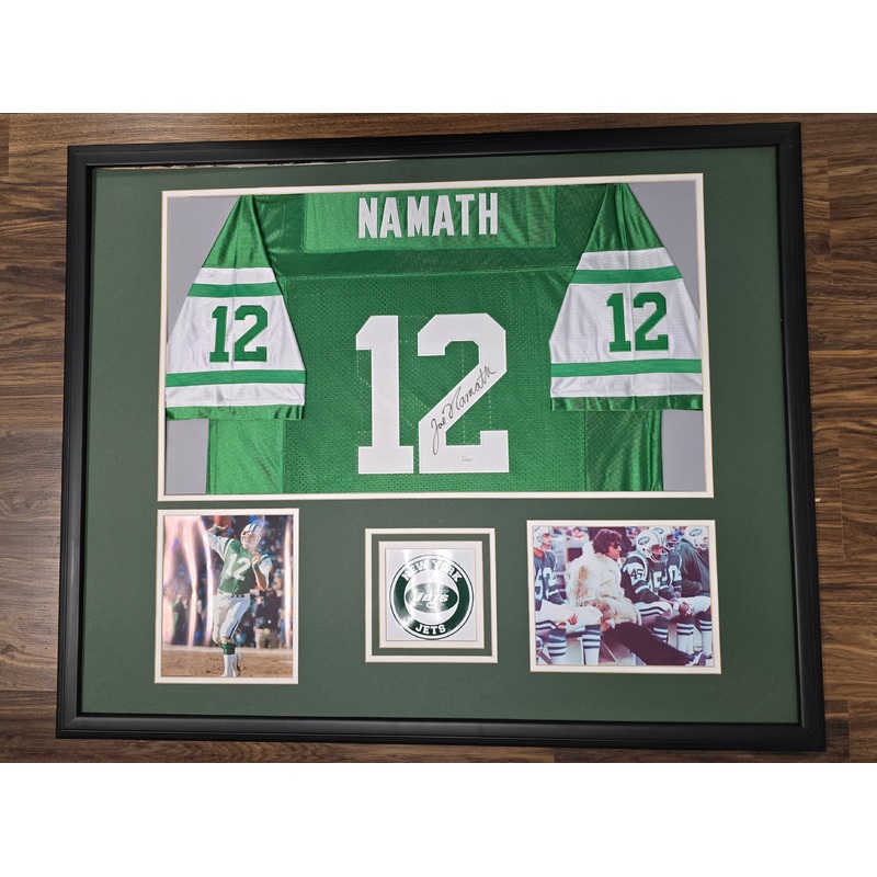 THIS MATTED MEMORIES EXCLUSIVE DESIGN FEATURES AN AUTHENTIC AUTOGRAPHED JERSEY OF JOE NAMATH COMPLETE WITH PHOTOGRAPHS & JETS LOGO.