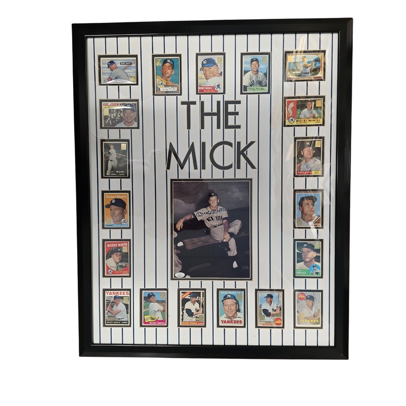 IN 1996 TOPPS RE-ISSUED MANTLE’S CARDS AS A MEMORIAL TO HIS OUTSTANDING CAREER. THIS SHOWCASE IS A TRIBUTE TO MANTLE AND A TRUE TRESSURE FOR ANY COLLECTOR. PROFESSIONALLY FRAMED WITH YANKEE PINSTRIPE MATTING WITH THE ENGRAVED INSCRIPTION “THE MICK”.