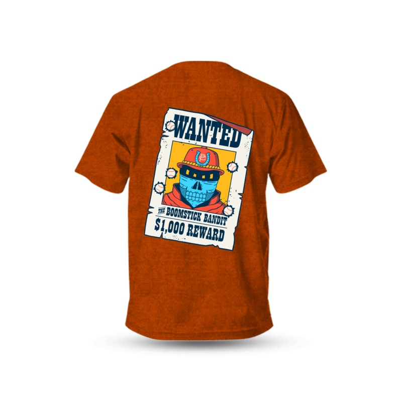 Ride into style and performance with the Wild West Rawhide Performance Tee . Built with a lightweight, athletic fit, this tee brings Western grit to the diamond. Featuring the PC horseshoe chest logo up front and a bold Wanted Poster graphic of the Boomstick Bandit on the back, this shirt delivers both comfort and swagger.