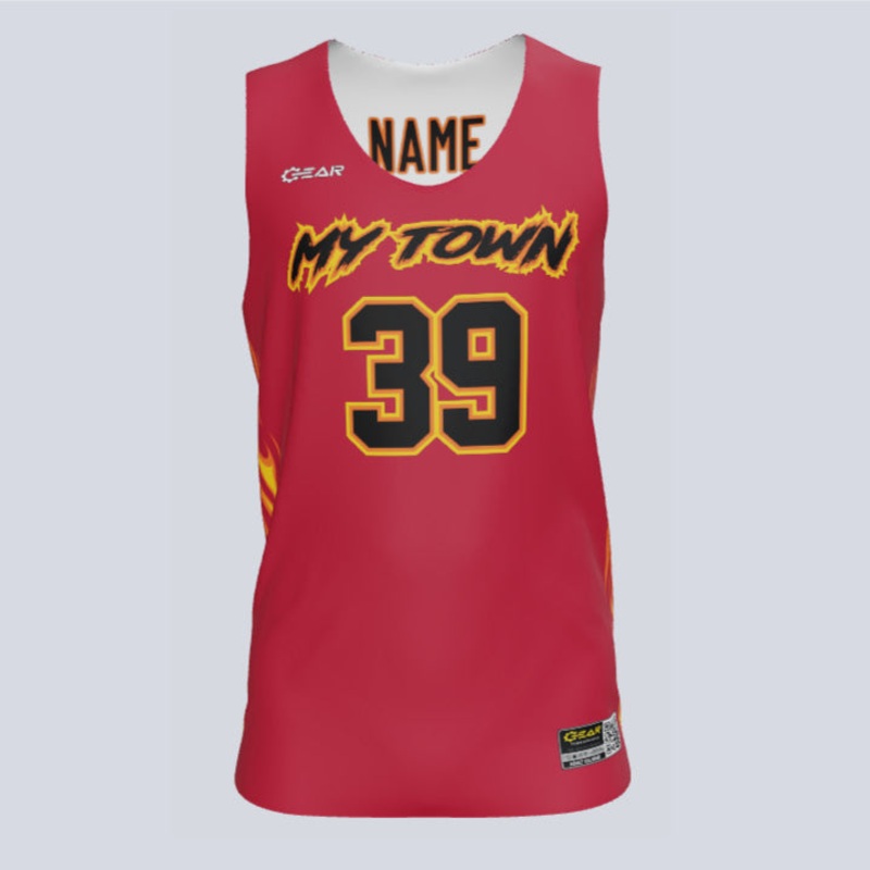 “Ignite the court with our ‘Blaze’ reversible basketball jersey. Tailored for your team, club, or school’s fiery flair, it’s a flame in the world of custom wear. Fan your unique design into existence, letting team pride burn brighter than ever. Fueled by advanced moisture-wicking tech, ‘Blaze’ ensures that while you’re turning up the heat on the court, you remain cool and dry, making every investment in ‘Blaze’ sizzle with satisfaction.”