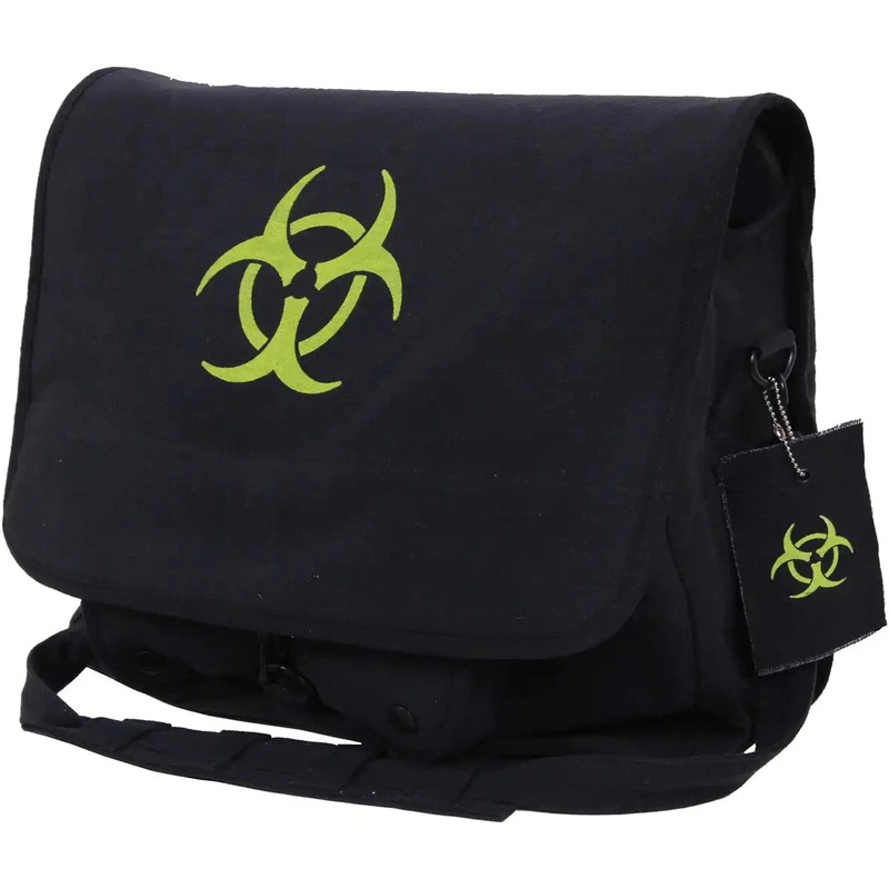 Rothco has taken our classic canvas messenger bag and added a zombie twist. The shoulder bag features a neon green bio-hazard symbol on the front flap with a detachable shoulder strap. The bag is perfect for fighting off a pack of zombies or carrying your school books.