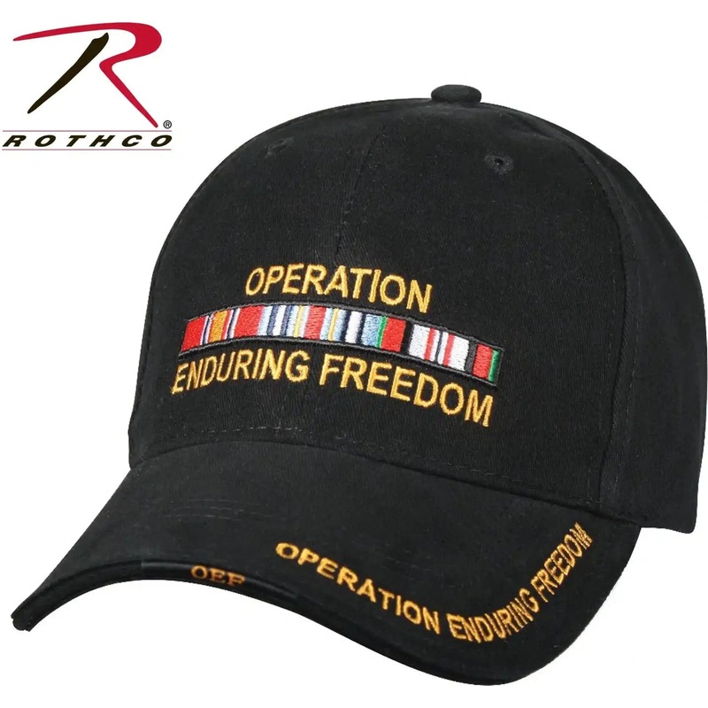 Rothco Deluxe Operation Enduring Freedom Low Profile Cap Features A 100% Brushed Cotton Twill With Raised 3-D Embroidered “Operation Enduring Freedom” Text & Service Ribbon On The Front Panel. The Cap Features A Sandwich Bill & Back Strap Insignia With Adjustable Hook & Loop Closure.