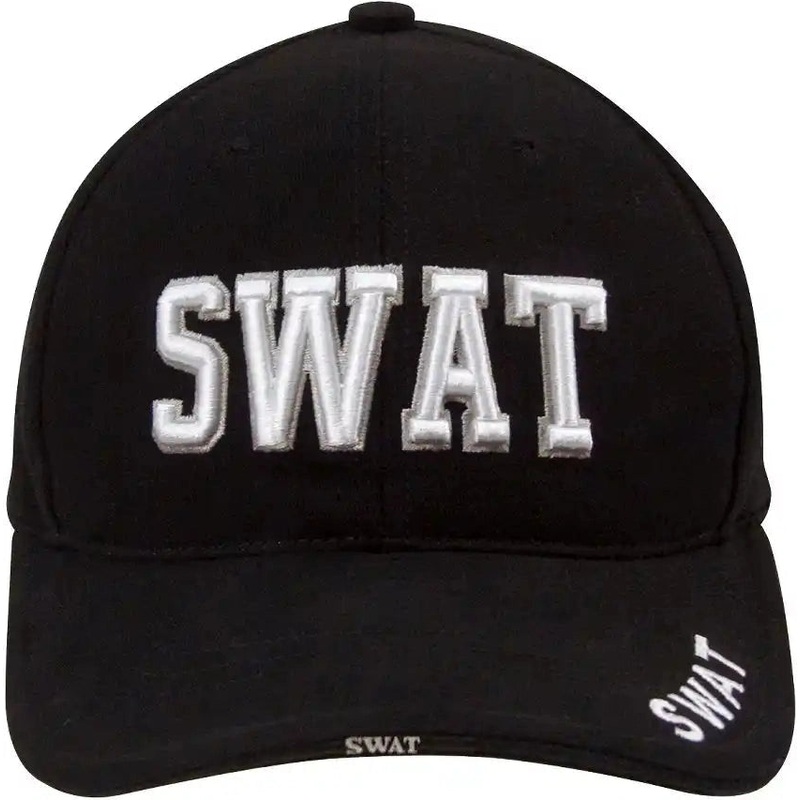 Rothcos Deluxe Swat Low Profile Cap, made from soft and durable cotton twill, features a raised 3-D embroidered SWAT text on the front panel as well as the brim and sandwich brim of the hat. This police hat also features a hook and loop closure in the back for adjustability.