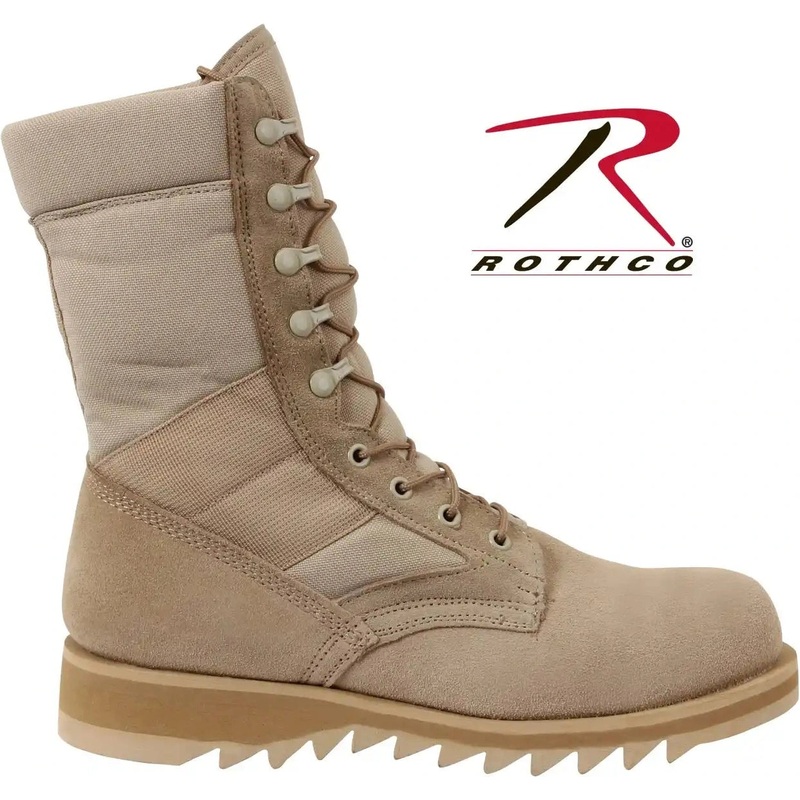 Rothco’s 10 inch Ripple Sole Desert Tan Jungle Boots combine classic style with modern features for optimal performance. Crafted from a durable blend of suede and leather, these boots provide robust protection and long-lasting wear. The 10 inch design offers superior ankle support, making them ideal for challenging terrains. The ripple sole design enhances grip, ensuring stability on various surfaces. A nylon-coated brass speedhook and eyelet lacing system provide quick and secure adjustments, while the midsole heat barrier and removable cushioned sole ensure maximum comfort during extended use. The steel shank adds extra support, reducing foot fatigue and enhancing overall stability. Whether trekking through rugged landscapes or engaging in outdoor activities, these boots are designed to keep you comfortable and secure. Designed with precision and built to withstand the harshest conditions, Rothco’s collection of footwear and accessories combines durability, functionality, and unparalleled performance. From our Forced Entry Series which features our speedlace and waterproof technologies, to our V-Max Collection designed with lightweight running shoe soles, our diverse range of footwear provides unmatched comfort and protection for everyone from active-duty personnel to outdoor enthusiasts. With a rich heritage spanning over 7 decades, Rothco is the go-to brand for all things that keep you standing on your feet.