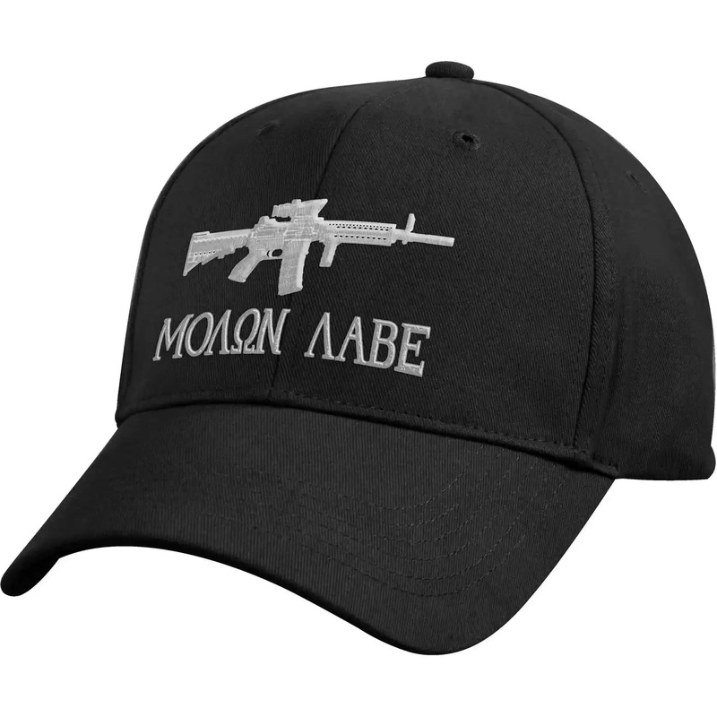 Rothcos Molon Labe Deluxe Low Profile Cap is embroidered with the iconic saying and rifle artwork on the front panel in silver. Molon Labe translates to come and take them. The 100% brushed cotton twill cap features a padded sweatband for added comfort and a hook and loop closure in the back for adjustability.