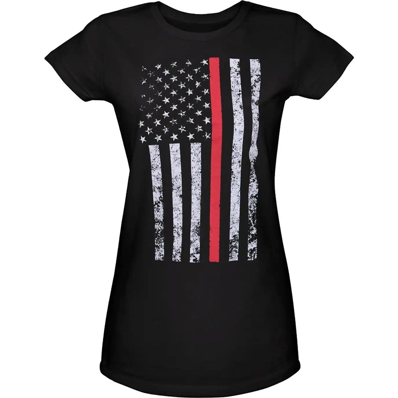 Rothcos Womens Thin Red Line Longer T-Shirt is made from a soft cotton/poly blend. The longer length style of this shirt extends past the waist and features a tagless label for extra comfort. A vertical distressed thin red line flag imprint is centered on the front chest of the t-shirt, as a symbol of respect and support for Firefighters.