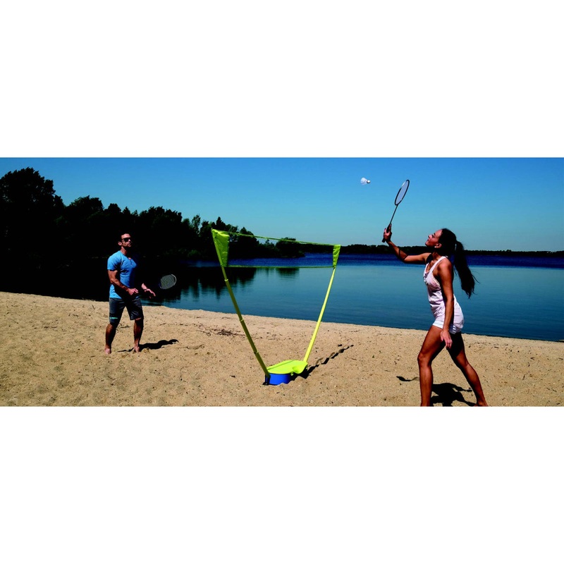 The innovative complete set for 2 players composed of 2 rackets in good leisure quality, tempered steel, visible T-joint, 2 shuttlecocks, innovative net (2,95×1,55m) with stable telescope bars made of plastic, all packed into a practical plastic-suitcase, which can be used as a net frame (can be filled with sand or stones, it provides more stability). Quick and easy assembly, no fixing to the floor required, therefore even set up on hard surfaces.