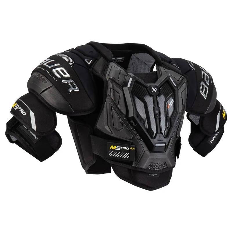 The BAUER Supreme M5 Pro Shoulder Pad features a Performance level of construction with the key upgrade of a floating sternum with CURV composite that provides lightweight protection. Also features a molded Hyperlite foam front panel that won’t absorb water and stays light all game long.
