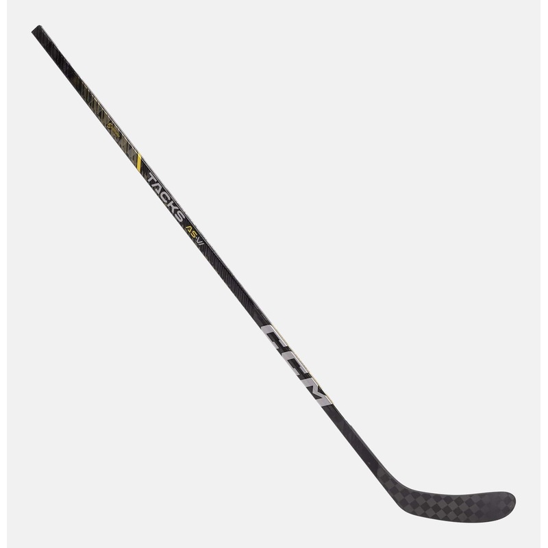 The stick keeps the familiar Tacks look in black with gold accents. The centre of the shaft also includes CCMs modern Tacks text logo, as well as the new AS-V logo.