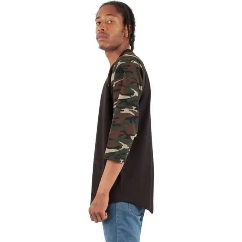 Shaka Wear SHRAGCM Unisex Three-Quarter Sleeve Camo Raglan T-Shirt – Black/ Camo Green