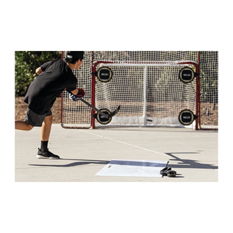 The heavy-duty Shooting Pad allows players to build their shooting, passing, stickhandling, and scoring abilities that make great players. With the Shooting Pad, theres no more damaging your favorite sticks trying to practice on concrete, asphalt, or other hard surfaces. Its silicone-infused surface creates ice-like action and realistic puck speed to provide the instant feedback players need during practice. This tool is a great way to build strength, cupping abilities, reaction times, and the muscle memory behind solid stick abilities. With a thick 5mm design and built-in carry handle, the pad provides seasons of easy use. The pad measures 28 x 42 to provide ample space for all kinds of cupping, passing, and shooting practice.