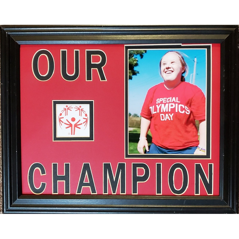 Custom engraved double photo mat boards feature One photo hole for a 5 X 7 Vertical photo complete with Special Olympics Logo.