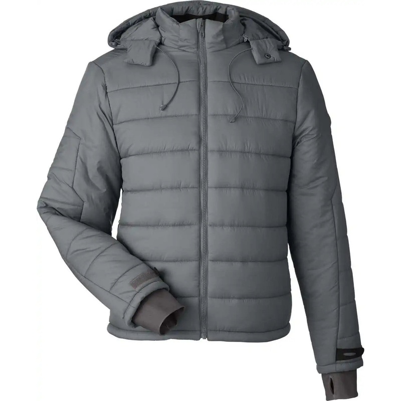 Puffer: 82% nylon, 18% elastane matte finish, recycled imitation down fill; Lining: 100% polyester;Adjustable zip-off hood, exposed molded zipper, internal draft flap; Debossed Spyder neck tape internal locker loop; Collar with brushed tricot, forward-set shoulder seams; Underarm ventilation system; Internal zippered chest pocket; Two internal drop-in pockets, secure zip hand pockets; Strategically placed internal stretch panels for mobility; Stretch storm cuffs with thumb holes; Adjustable, internal hem cinch-cord; High-definition Spyder wordmark ; Raised silicone Spyder Bug patch ;