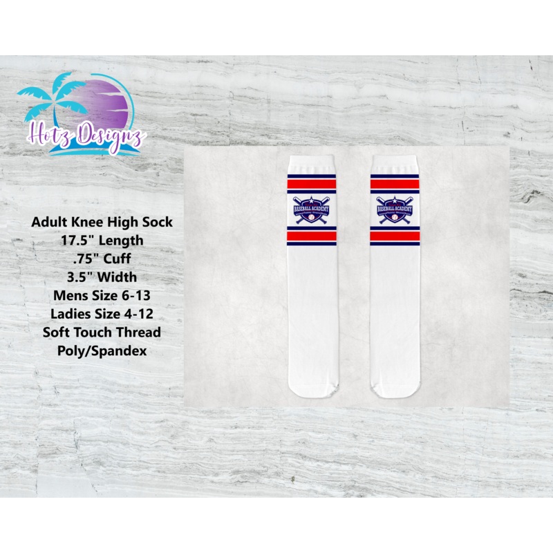 Soft touch poly/spandex knee high sock embellished with TBBA logos. Pairs perfectly with knicker baseball pants.