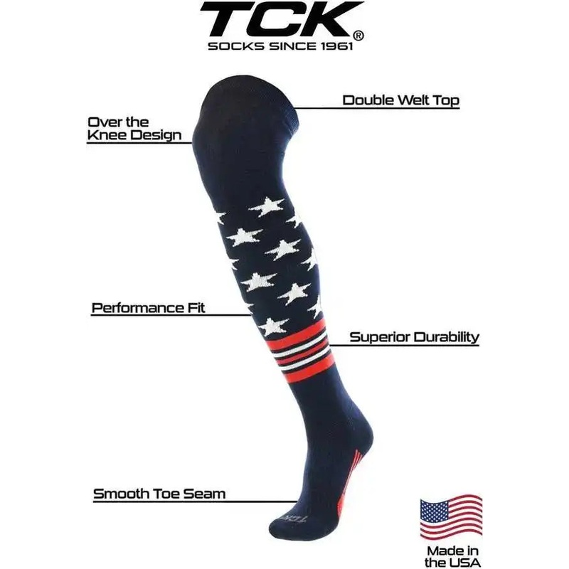 The TCK USA Freedom over-the-kneesocks feature moisture control technology which wicks moisture away to keep your feet dry and prevent blisters. There is also a breathable mesh at the top of the foot which helps air flow through the sock. Additionally,the socks are made with advanced yarns to help control odors.
