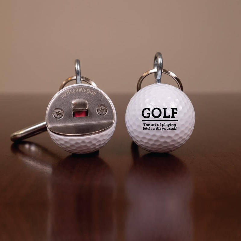 - The golf ball is machined to fit a stainless steel opener plate and a carabiner keychain.