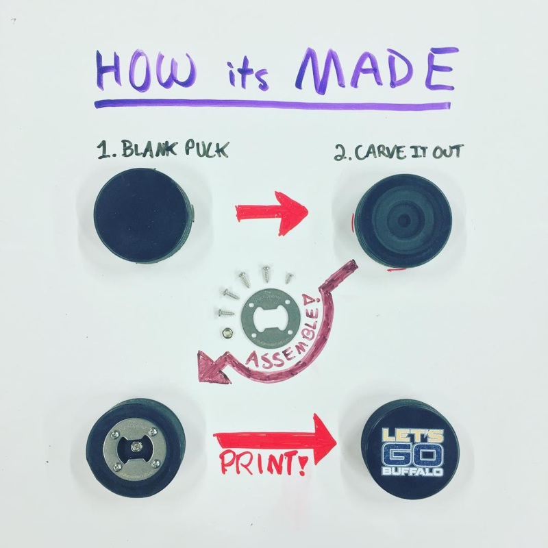 The combination of hockey and beer is hard to improve on but The PuckOpenerTM brings the pairing to a whole new level. It’s a bottle opener made from a REAL hockey puck. Naturally sized to fit in your hand, its a must have whether youre celebrating a win or drowning your sorrows after a loss.