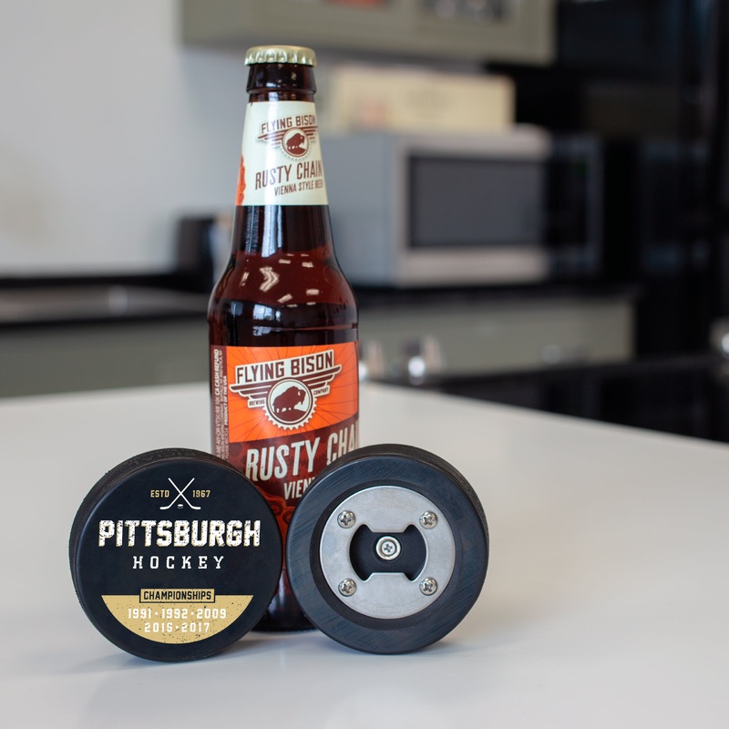 The combination of hockey and beer is hard to improve on but The PuckOpenerTM brings the pairing to a whole new level. It’s a bottle opener made from a REAL hockey puck. Naturally sized to fit in your hand, its a must have whether youre celebrating a win or drowning your sorrows after a loss.
