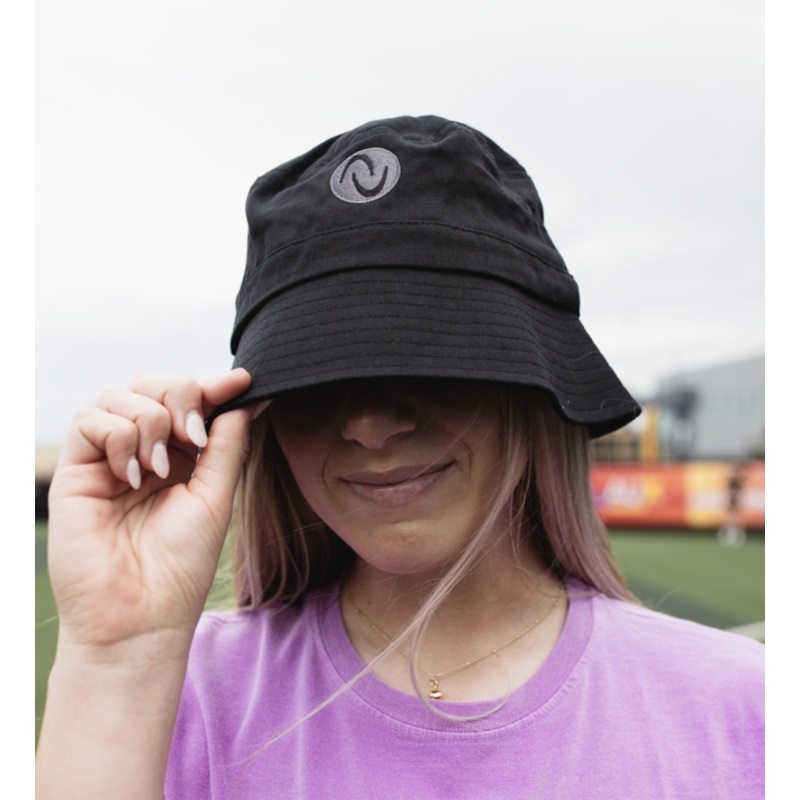 Black bucket cap, featuring our signature logo embroidered at center front.