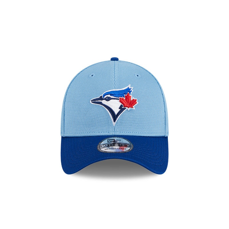 Represent your team with the Toronto Blue Jays 2024 Batting Practice 39THIRTY Stretch Fit Cap features an embroidered Blue Jays logo at the front panels with a matching team wordmark at the rear. Additional details include a pivot knit fabrication, a blue visor, and a gray undervisor.
