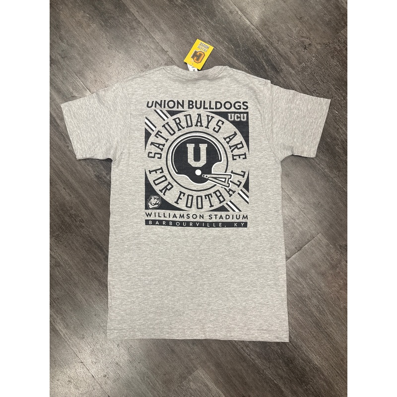 Grey tee with helmet on front. “Saturdays are for football” lettering