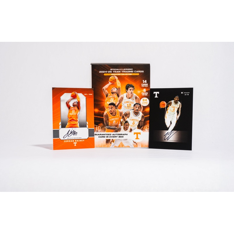 The platinum box contains six packs of officially licensed Tennessee Volunteers 2024 men’s basketball trading cards from the team set. Each pack contains 14 cards with a mix of base cards, parallel cards, and rare specialty insert chase cards! One of the packs includes a guaranteed autographed card.