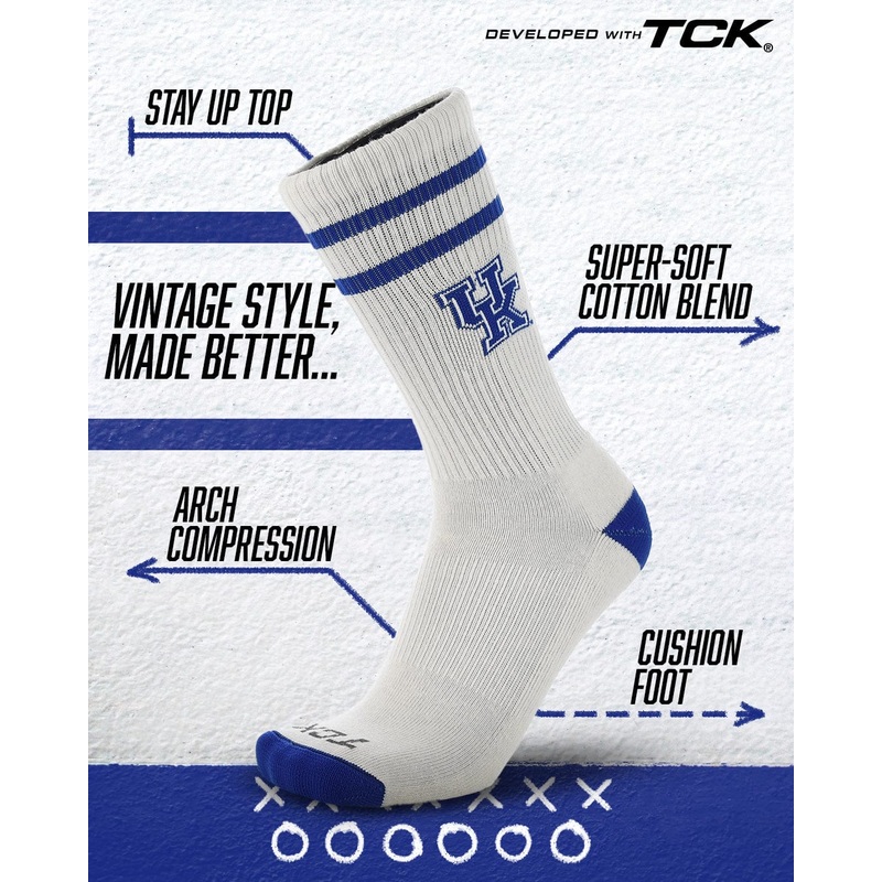 Show off your school pride with these Kentucky Wildcats socks. TCK’s Vintage NCAA Socks, is a perfect blend of nostalgia and modern comfort. Each pair of TCK socks for UK Wildcat fans is designed to reflect the history and tradition, making them the perfect addition to any fan’s wardrobe. These socks are designed for die-hard fans who appreciate both style and performance. Whether you’re cheering from the stands or showing your pride around town, these socks offer the ideal way to support your favorite team. Made with super soft cotton, these socks provide comfort with every step. The arch compression ensures a secure fit, giving you the support you need during any activity. A smooth toe seam prevents irritation, while the breathable mesh design keeps your feet cool and dry. The half cushioned footbed delivers just the right amount of padding, making these socks perfect for all-day wear. Plus, the double welt stay-up top ensures that your socks stay in place, no matter how active you are. Proudly made in the USA, TCK’s Vintage NCAA Socks are a testament to quality American manufacturing. Show your true colors and show your pride in these classic, comfortable, and durable socks.