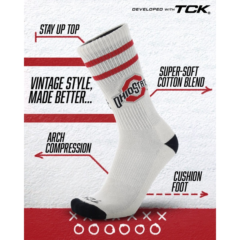 Show off your school pride with these Ohio State Bukeyes socks. TCK’s Vintage NCAA Socks, is a perfect blend of nostalgia and modern comfort. Each pair of TCK socks for OSU Buckeye fans is designed to reflect the history and tradition, making them the perfect addition to any fan’s wardrobe. These socks are designed for die-hard fans who appreciate both style and performance. Whether you’re cheering from the stands or showing your pride around town, these socks offer the ideal way to support your favorite team. Made with super soft cotton, these socks provide comfort with every step. The arch compression ensures a secure fit, giving you the support you need during any activity. A smooth toe seam prevents irritation, while the breathable mesh design keeps your feet cool and dry. The half cushioned footbed delivers just the right amount of padding, making these socks perfect for all-day wear. Plus, the double welt stay-up top ensures that your socks stay in place, no matter how active you are. Proudly made in the USA, TCK’s Vintage NCAA Socks are a testament to quality American manufacturing. Show your true colors and show your pride in these classic, comfortable, and durable socks.