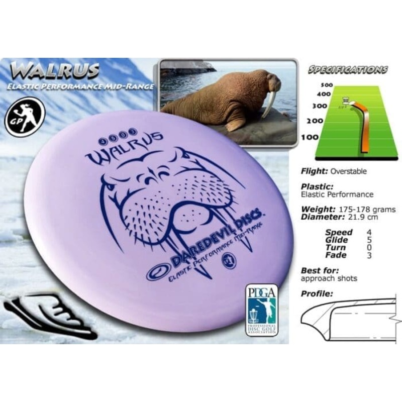 The Walrus is at your service right out of the box. A unique mid-range in the Daredevil Discs Elastic Performance Plastic, the Walrus has a shot shaping stability that does not require a lot of arm speed to unlock its magic. It has surprised many with its glide, and with a dependable fade it will perform for you on many holes, courses and lines. Feels wonderful in the hand. Coo coo cachoo.