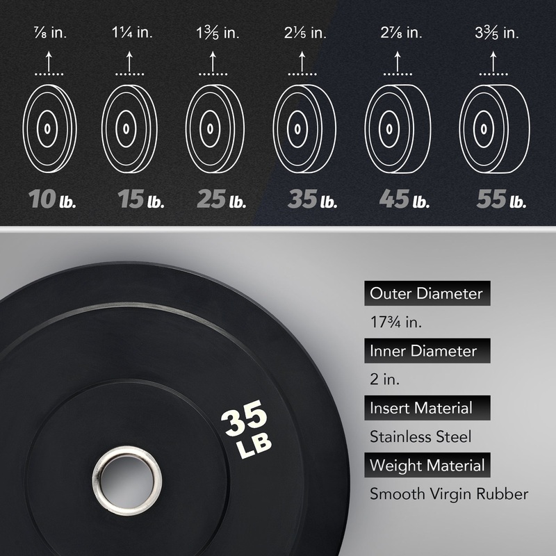 - CLEAR WEIGHT MARKING: Keeping organization and change-outs quick and easy, each bumper plate is clearly marked with high-contrast white weight markings in pounds, easily read from across the room