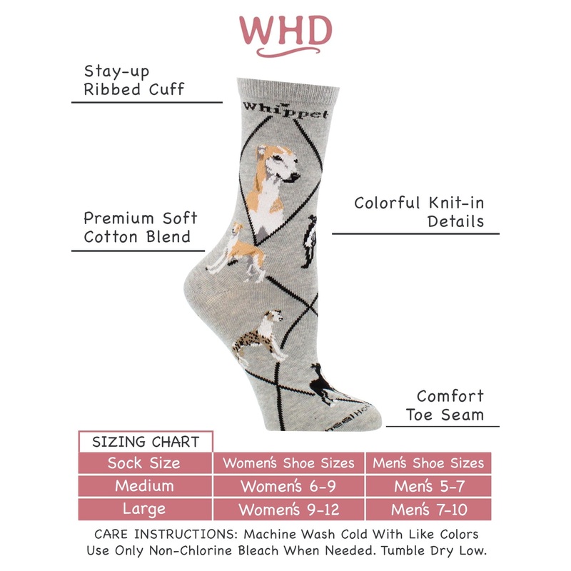 - PERFECT FOR DOG LOVERS – With it’s sleek frame and desire to run, the gentle Whippet can always be counted on for its sweet temperament and independent spirit. Show your devotion for this family friend in the Wheel House Designs crew socks.