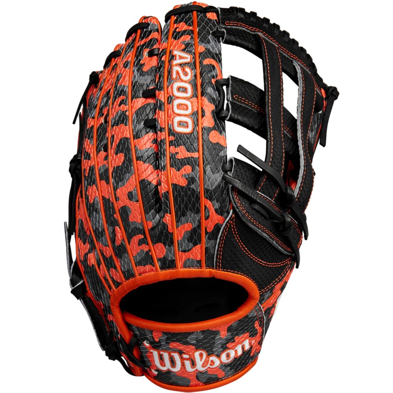 Bring the spooky vibes with this A2000 1777a newer outfield glove model based on the A2000 1799 with a narrower heel for a more secure fit. Orange, Black and Grey Camouflage SuperSnakeSkin reduces weight and Spin Control Technology grips the ball in the Pro Stock leather palm.