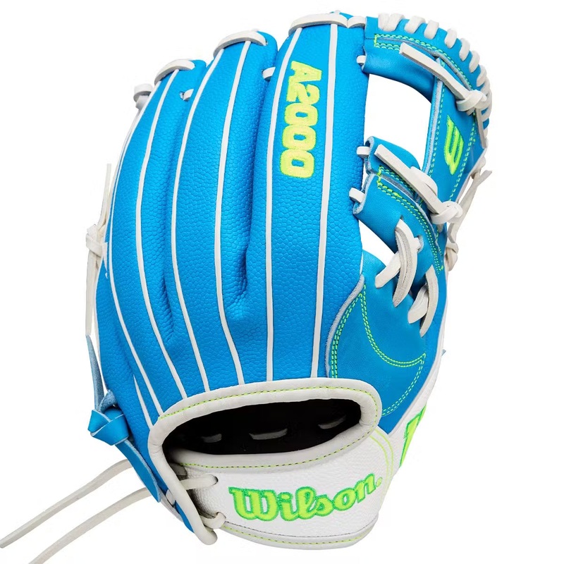 The Wilson A2000 H12 SuperSkin 12″ Fastpitch Softball Infield Glove is expertly crafted for serious fastpitch players, featuring an H12 glove pattern with an I-Web design for optimal performance on the field. The eye-catching blue, white, and green colorway is complemented by Pro Stock Leather, known for its durability and premium feel. With SuperSkin backing, this glove is twice as strong as regular leather, ensuring longevity while remaining lightweight. The conventional open back and adjustable drawstring closure offer a customizable fit, while the Dri-Lex wrist lining keeps your hand dry and comfortable during intense games. Enhanced by flat finger binding and rolled dual welting, this glove provides a comfortable feel and retains its shape over time, making it a top choice for fastpitch infielders.