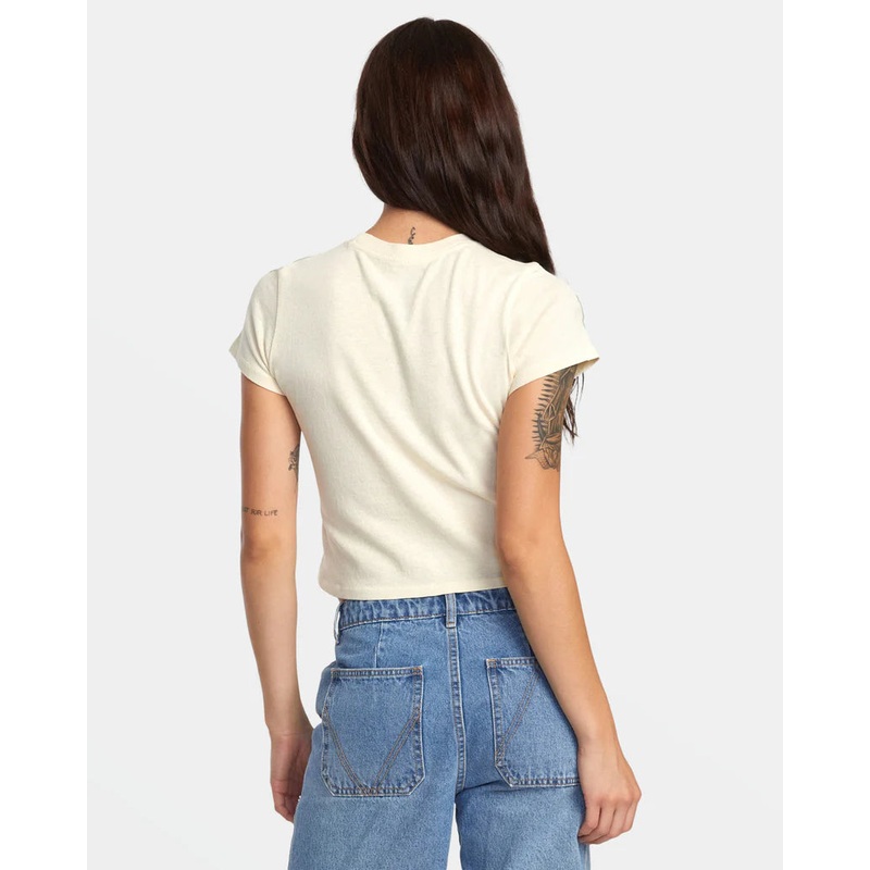 Experience the ultimate comfort and style of RVCA Women’s 411 T-Shirt. Crafted with a loose-knit cotton jersey and pigment-dyed for a vintage look, this fitted tee features graphic screen prints on the front and back.