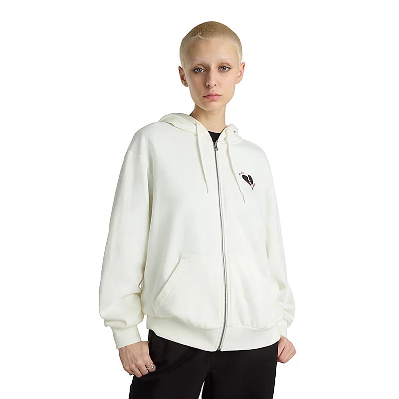 The Vans Broken Hearts Blousant Pullover Hoodie has a full-front zip, long sleeves and two front pockets. It also has blousant sleeves and graphics on the left chest and back.