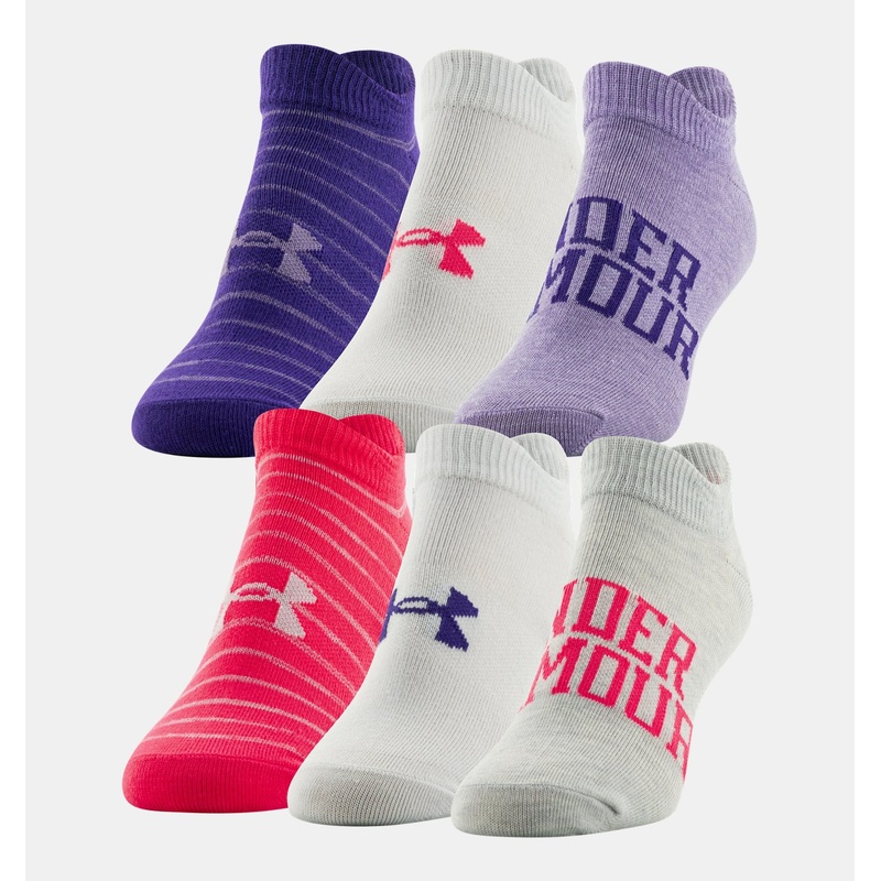 These women’s UNDER ARMOUR Essential No Show cerise/white/grey athletic socks treat you with the right support and comfort. Boasting of an adaptive flat knit construction for great touch and feel, this 6-pack has moisture-wicking polyester, nylon and elastane construction, odor-wicking anti-odor technology, flattering new stitch design, and embedded arch support to minimize foot fatigue.